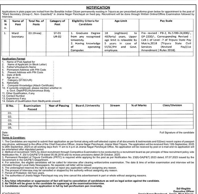 Ward Secretary Recruitment 2025: Jirania Nagar Panchayat Government of Tripura has issued an notification for the post of Ward Secretary Group-C. Here all eligible & interested candidates can apply.